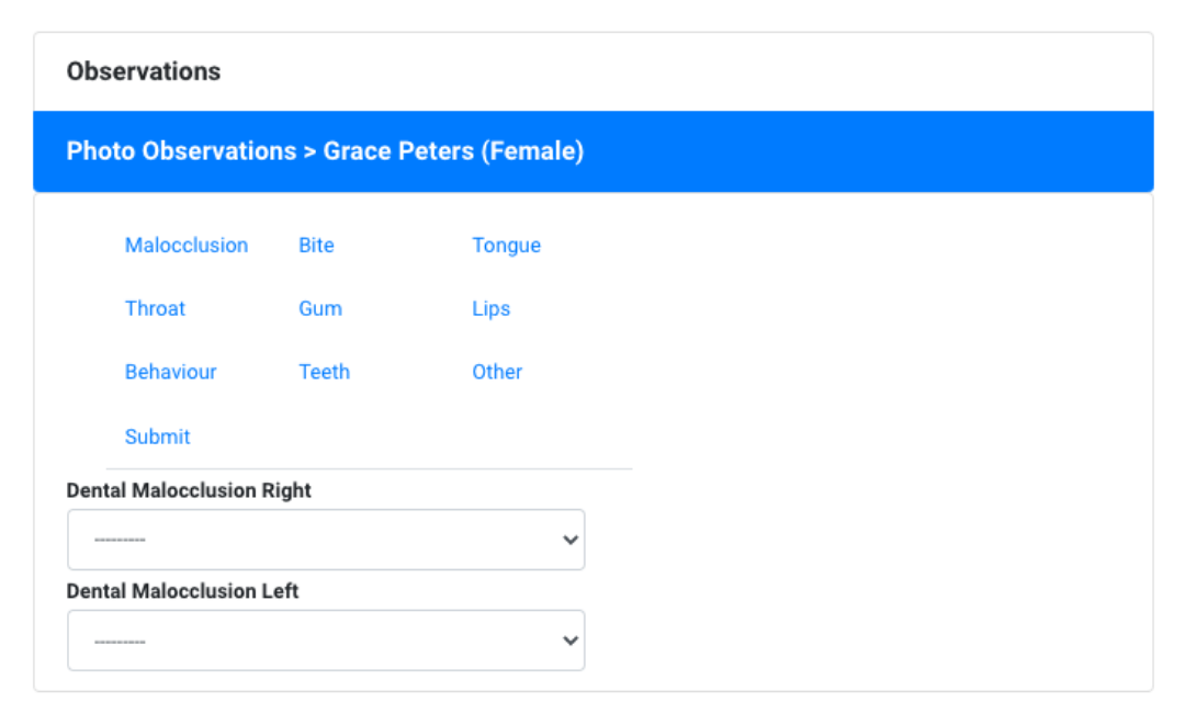 You'll then be guided through photograph observations, commenting on the dental malocclusion, bite, tongue, throat, gums, lips, behaviour and more. Just like your x-ray observations, you can search from an easily searchable menu, pre-tick commonly used terminology and add additional notes.