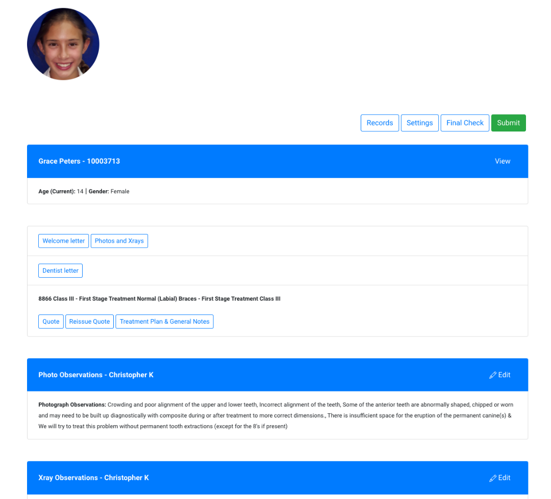 Create a comprehensive treatment report using the records uploaded during the new patient consultation. You’ll be guided through a process of reporting on a patient in the reporting journey, allowing you to focus on all aspects of the case including, photo observations, x-ray observations, observations about the teeth and much more.