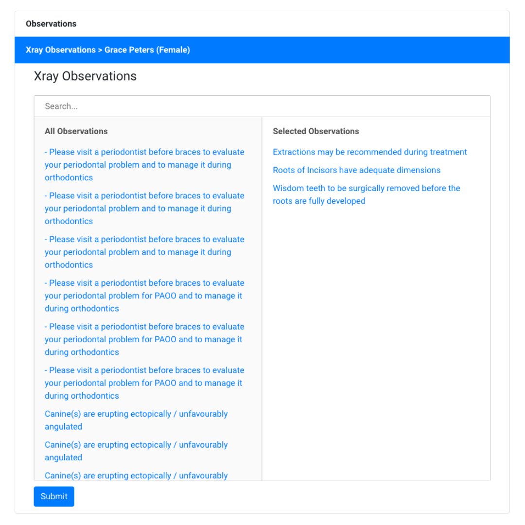 Start the reporting journey by reviewing the patient's x-rays. Enter the measurements from your cephalometric tracing and Hugo Systems will calculate the skeletal malocclusion for you. Select observations from an easily searchable menu. You can also pre-tick commonly used terminology, to speed up reporting. If you come across a unique case, you can also add additional notes, giving you a great deal of flexibility.